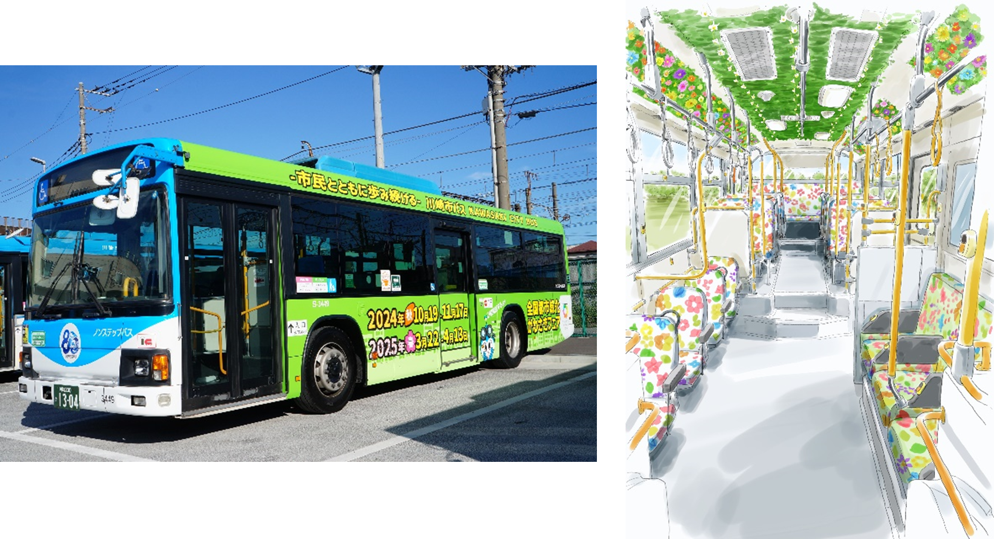< 全国都市緑化かわさきフェアコラボラッピングバスと車内装飾のイメージ >
