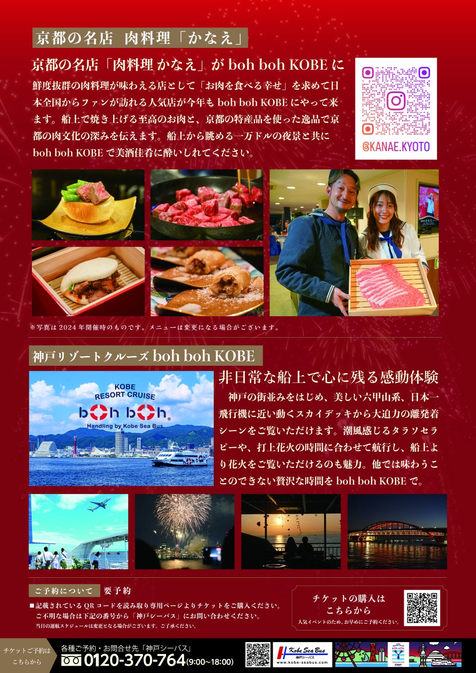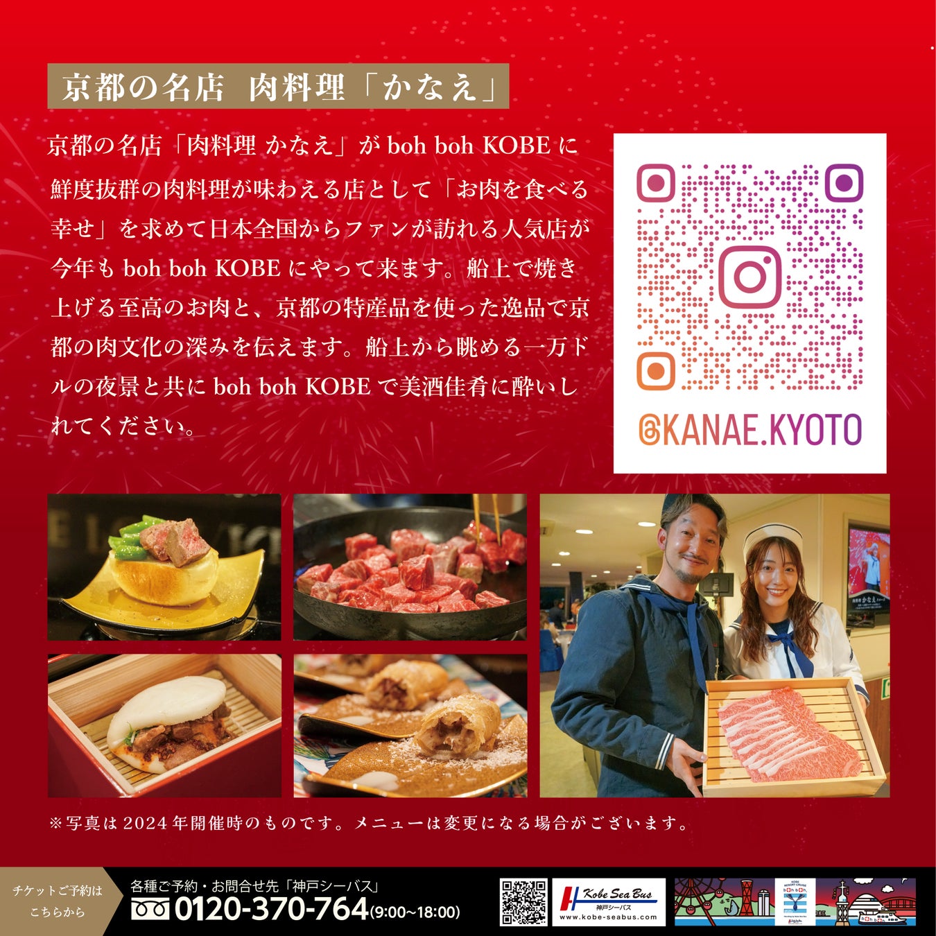 鮮度抜群の肉料理が味わえるお店として、「お肉を食べる幸せ」を求めて日本全国からファンが訪れる人気店「肉料理 かなえ」が今年もboh boh KOBEにやって来ます。船上で焼き上げる至高のお肉と、京都の特産品を使った逸品で京都の肉文化の深みを伝えます。