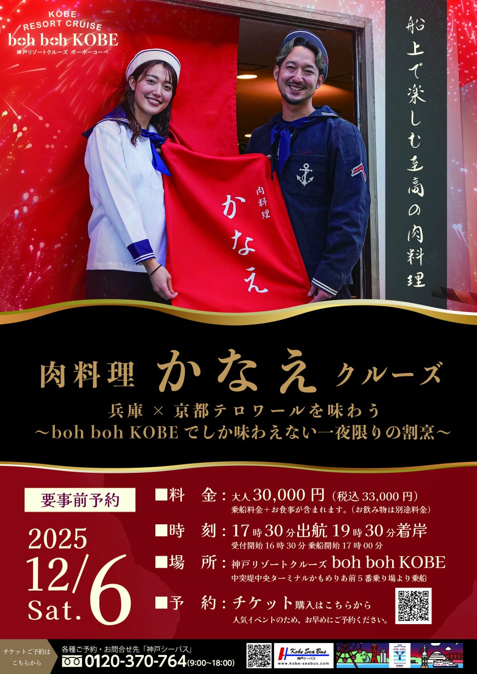 神戸シーバス boh boh KOBEでは12月6日(土)に、兵庫×京都テロワールを味わう一夜限りの特別イベント『肉料理 かなえクルーズ~boh boh KOBEでしか味わえない絶品肉料理~』を開催します!