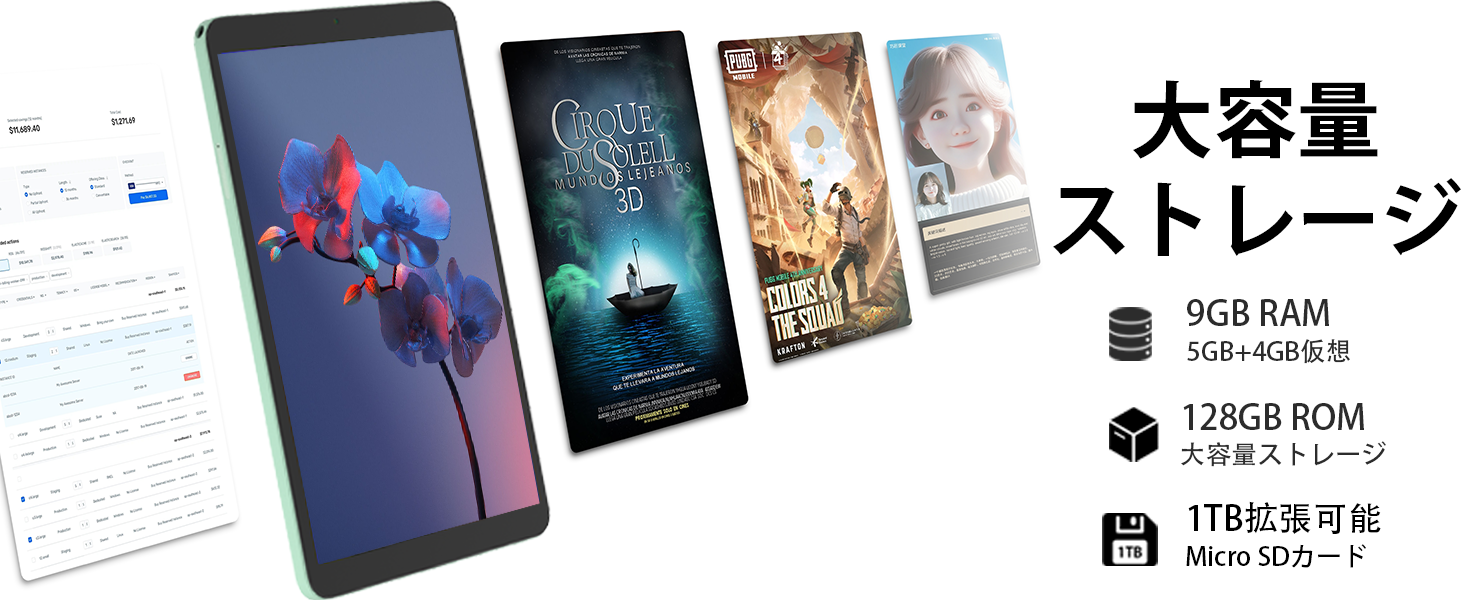 8.4インチ1920*1200解像度2K全視野角スクリーンで、広角視野と高解像度の画像は完璧な視覚効果をもたらし、すべてのビデオ鑑賞を楽しくします。DOOGEE T20MINI KIDは、最大4GBのメモリ+最大5GBの拡張可能な仮想メモリ、合計9GBの融合メモリを搭載しています。これにより、タブレットは複数のアプリケーションを簡単かつスムーズに切り替えることができ、ラグをなくし、高速でスムーズな操作体験を提供します。128GBの大容量ストレージも搭載されているため、メモリ不足を心配する必要はもうありません。 大容量の1TBまでのmicroSDカードでストレージ容量をさらに拡張できます。(FAT32、exFATフォーマットカードは別売り)