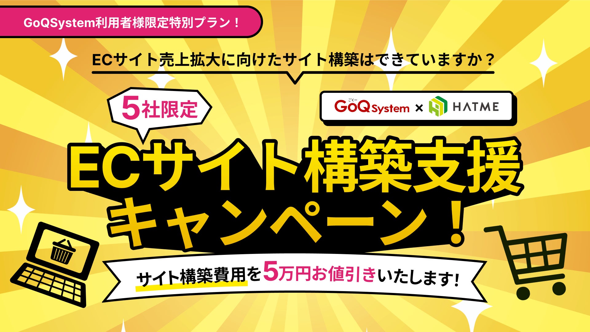 2024年8月1日(木)~2024年11月30日(土)まで、受注一元管理システム「GoQSystem」利用者様限定で、 特別にサイト構築費用を”5万円”お値引きさせていただきます!
