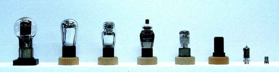 真空管の歴史(左から テニスボール型、ナス型、ST管(2本)、GT管(2本)、MT管、NuVista管)