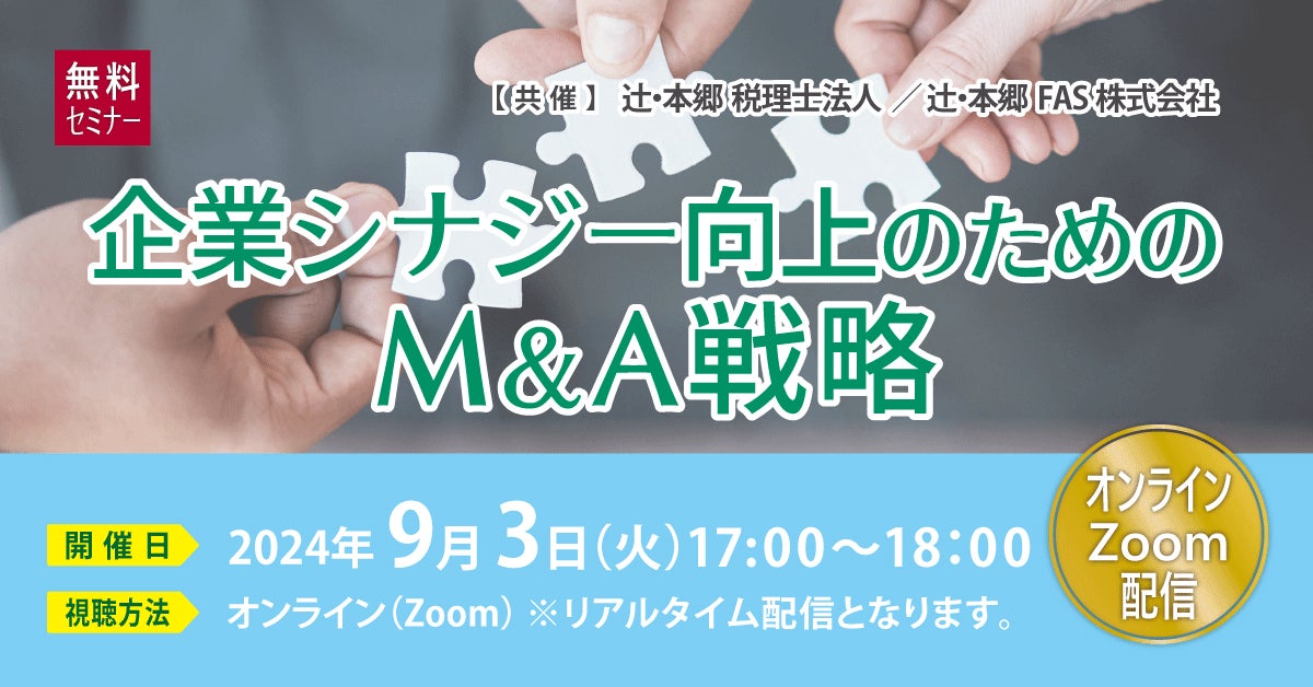 辻・本郷 税理士法人(本社:東京都新宿区、理事長:徳田孝司)は、辻・本郷 FAS株式会社(本社:東京都千代田区、代表取締役:山田翔吾)と2社共催で「企業シナジー向上のためのM&A戦略」セミナーを開催いたします。本ウェビナーでは企業シナジーを向上させるためのM&A戦略について、辻・本郷のコンサルタントが詳しく解説します。また、M&Aにかかせないデューデリジェンスの留意点も説明します。