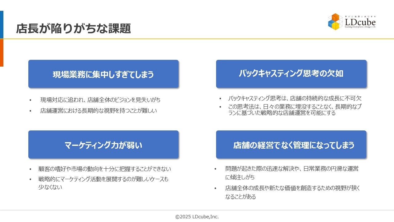・店長が陥りがちな課題を理解する ・店長に求められる役割・スキルを理解する ・店長育成に経営シミュレーションが効果的な理由を理解する |
