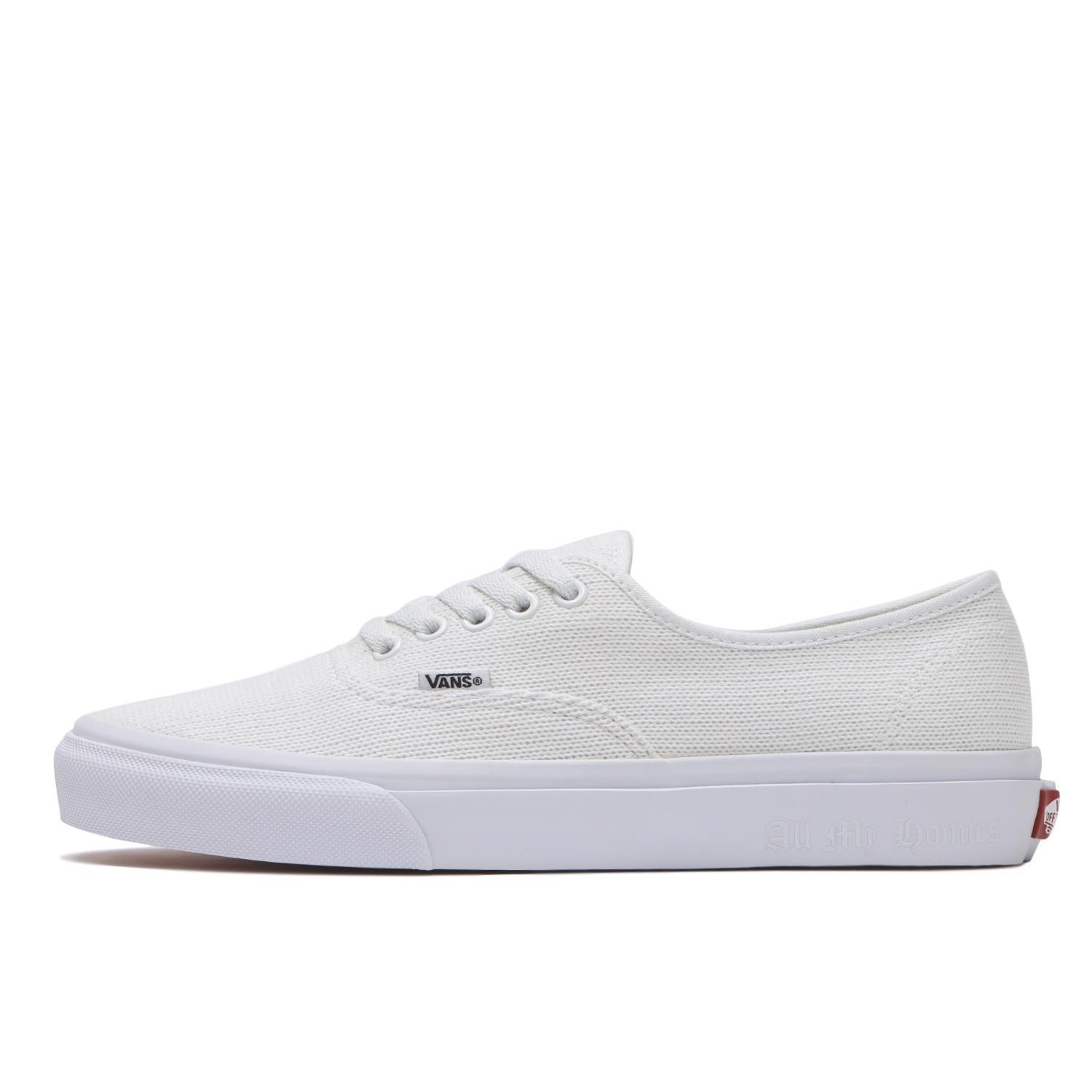 Authenticは、アッパーに厚手の白いキャンバス素材と、アグレットとシューズ内部に黄色のアクセントを加えることで、一般的な綿素材の軍手を表現しました。ソール部分に同色で施された「All My Homies」のロゴが、シンプルながらも洗練された存在感を与えています。