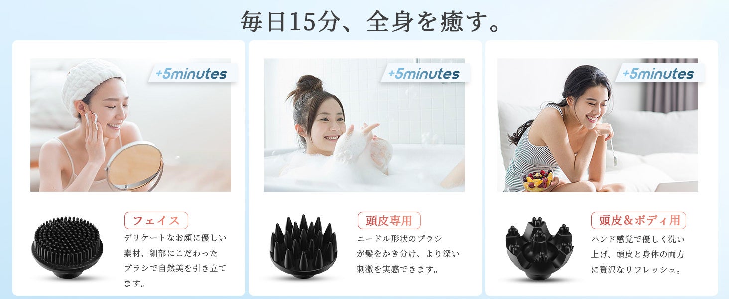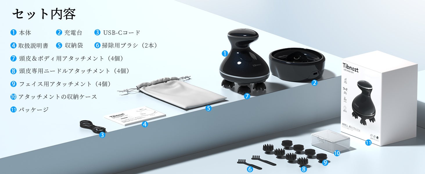 頭皮専用、ボディ用、フェイス用の3つのアタッチメントが付属しており、それぞれに応じたケアが可能です。アタッチメントはすべてEMS機能に対応しており、収納ケースも付属しているため、使いやすさと収納性に優れています。