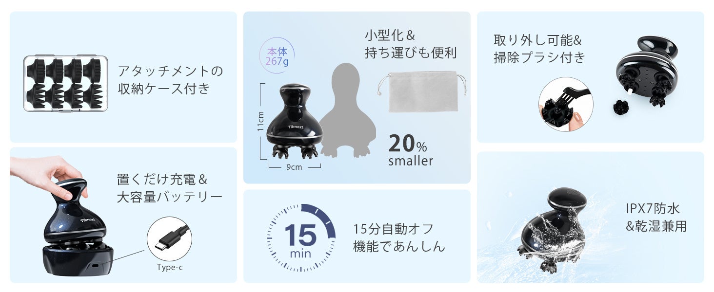 TibnoztのEMSヘッドスパは、プロフェッショナルの技術を忠実に再現し、4種類の回転モードと6種類の動作で、まるでプロにマッサージを受けているかのような快適な頭皮ケアが可能です。さらに、1分間に約9,000回の振動機能を搭載。シャンプー中に使用すれば、手だけでは落としにくい汚れもしっかりと洗浄し、柔らかな頭皮へと導きます。