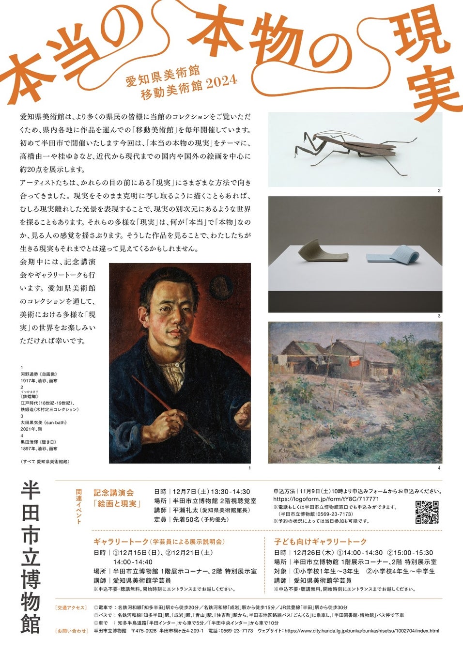 愛知県美術館が毎年開催している「移動美術館」を、半田市で初めて開催します。本展では、愛知県美術館に所蔵されている豊富なコレクションの中から厳選された、近代から現代までの国内外の絵画などをご紹介します。愛知県美術館のコレクションを通して、美術における多様な「現実」の世界をお楽しみください。