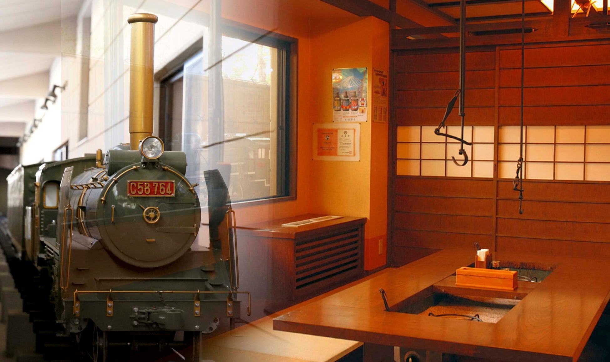 ミニSL列車が食事を運ぶ個室のお食事処お狩場では、3種の鍋料理が味わえます。