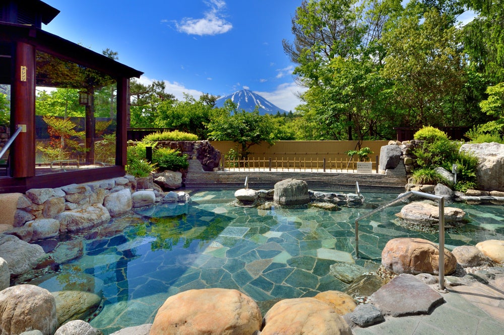目の前に富士山を眺めながらお風呂に浸かることができる「霊峰露天風呂」や「パノラマ風呂」の他、炭酸泉や洞窟風呂など全16種類のお風呂が揃う日帰り温泉施設です。館内には、お風呂の他にも、日頃の疲れを癒してくれるボディリフレッシュルーム「おあしす」や、地元山梨の食材を使用した料理が味わえるお食事処の「ふじざくら」、SL列車が食事を運ぶ個室のお食事処「お狩場」もございます。他にもお風呂上りにゆっくりお寛ぎいただける無料休憩室、迫力満点の富士山を眺める有料休憩室もございます。お風呂でリフレッシュした後は、館内の充実した設備でくつろぎのひと時をお過ごしください。