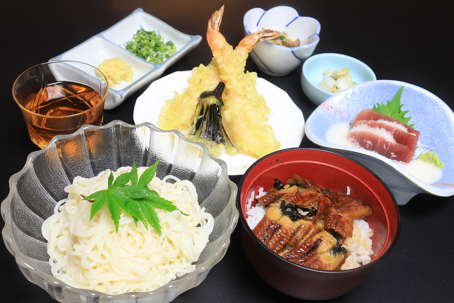お食事処お狩場では、人気メニュー「ほうとう鍋」に加え、新たに「冷や麦御膳」をご用意。ミニうな丼と海老・アナゴ・茄子の天ぷら三種、まぐろの山かけなどがセットになった贅沢な御膳です。