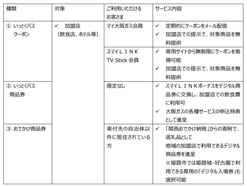 「いっとくパス」とは、大阪ガスが運営する、家庭用のお客さまと飲食店等をつなぐデジタルチケットサービスです。運用基盤として「e街プラットフォーム®️」(運営:株式会社ギフティ)を活用しています。無料クーポンの配布やポイントによるデジタル商品券への交換等を通じて、加盟店で飲食等をお得に楽しんでいただけます。また、本デジタルインフラを活用し、現地消費型のふるさと納税である「関西おでかけ納税」およびその返礼品として地域の飲食店等で利用できる電子商品券「おでかけ商品券」も発行されています。