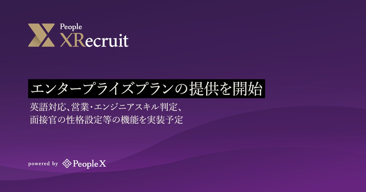 採用から活躍支援まで、AIで人事課題を解決する株式会社PeopleX(本社:東京都新宿区、代表取締役CEO:橘 大地)は、対話型AI面接サービス「People XRecruit(ピープル・クロスリクルート)」のエンタープライズプランを提供開始したことをお知らせいたします。セキュリティをより強化し、今後は英語での面接対応や、営業・エンジニア等の専門職のスキル判定、AI面接官の「性格」設定などの機能を実装予定です。