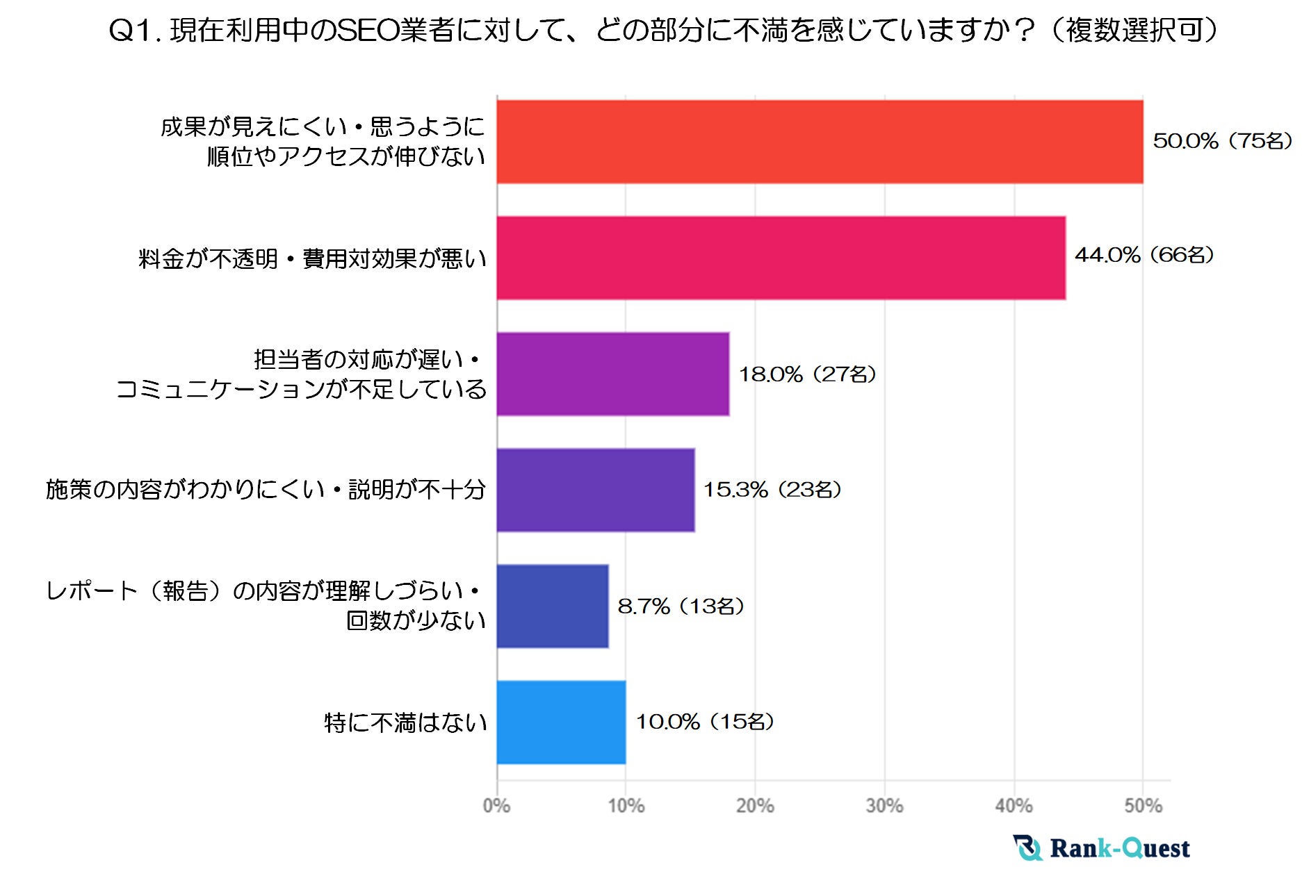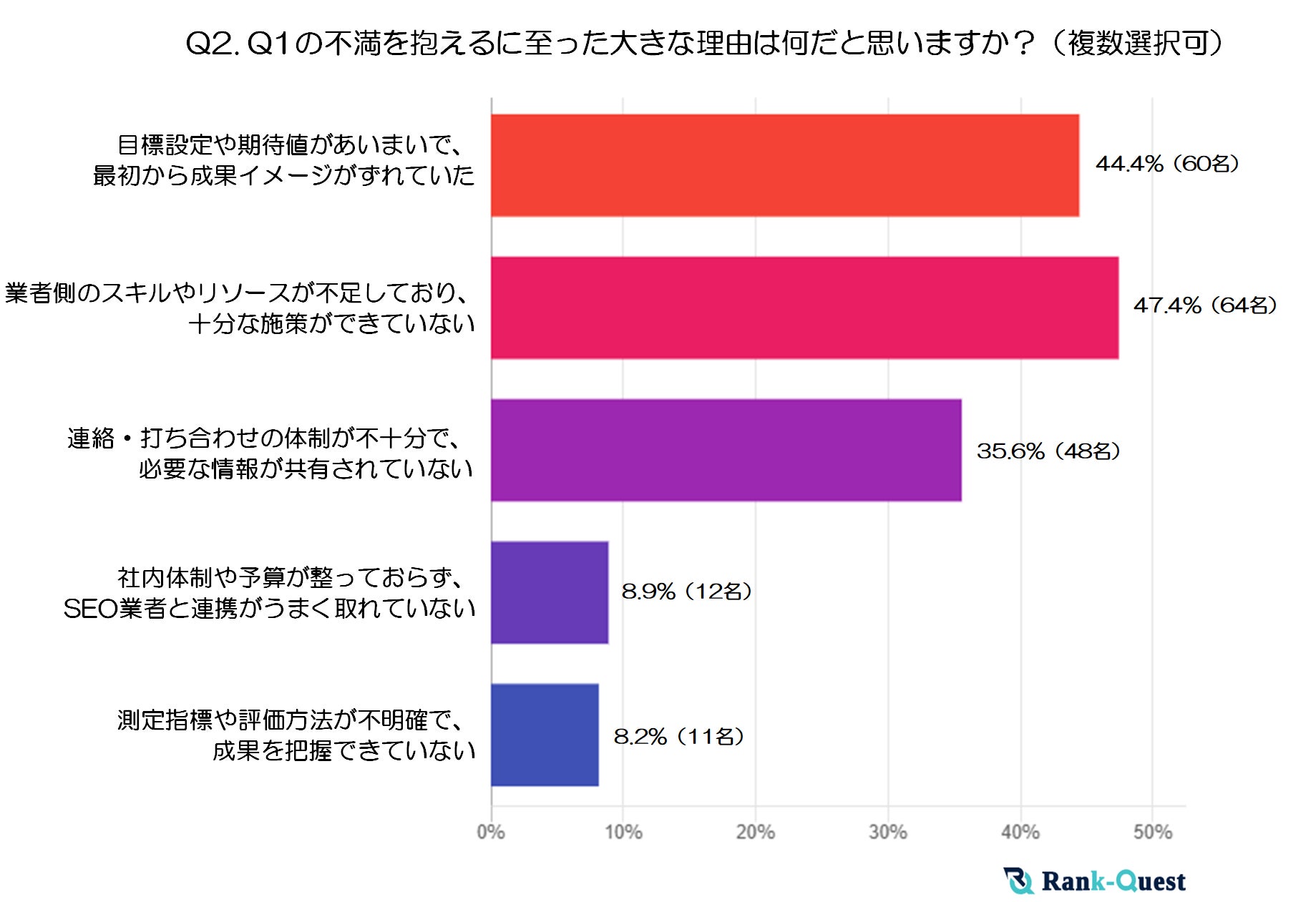 Q1では「成果が見えにくい」や「料金の不透明さ」などが大きな不満要因として挙がっていました。効果がはっきりしない状態が続けば、別の業者に任せた方が良いのではという意識が高まりやすいでしょう。