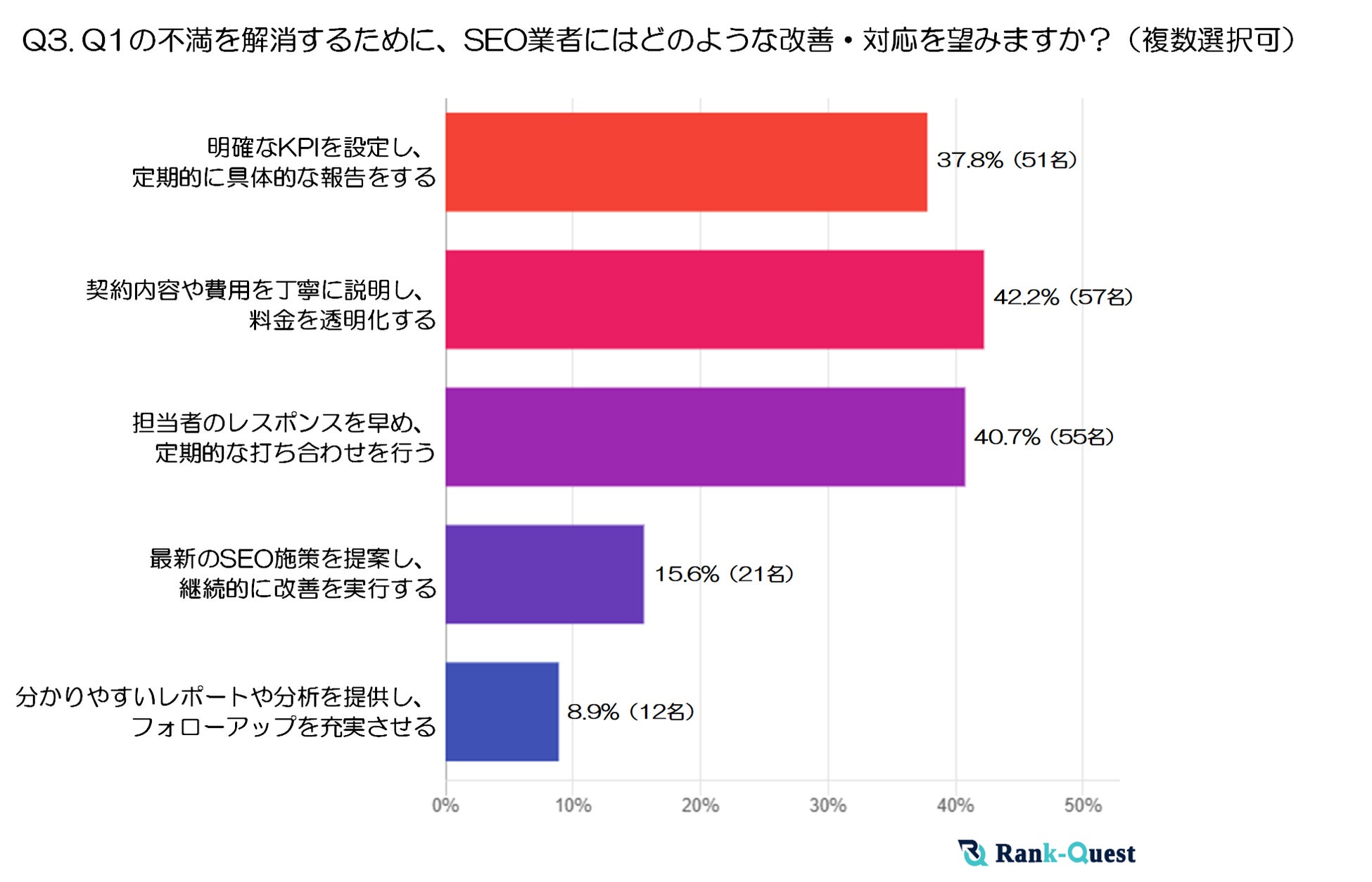 3番目に多かった「明確なKPIを設定し、定期的に具体的な報告をする」(37.8%)も、Q1・Q2で見られた「成果が見えにくい」「目標設定や期待値があいまい」という不満を解消するうえで重要なポイントです。SEOではキーワード順位やアクセス数に注目しがちですが、それだけでなくコンバージョンや問い合わせ数など、ビジネス目線での成果指標を設定し、そこに到達するまでの経過や対策内容を定期的に報告することで、依頼主側の安心感や納得度も高まります。