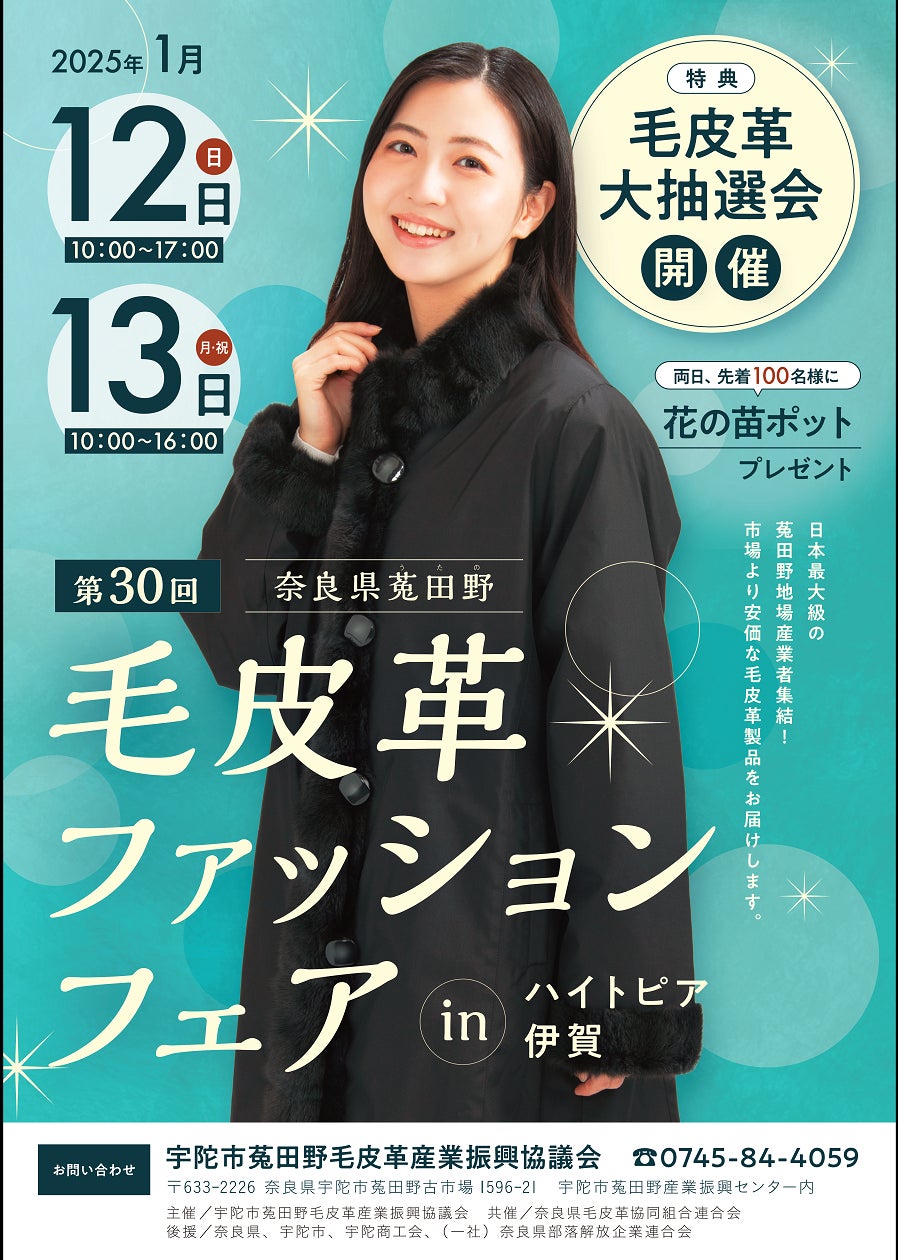 奈良県の重要な地場産業の一つである毛皮革産業のPRと販路開拓を目的に、各種毛皮革製品を展示・販売する「第30回毛皮革ファッションフェア」が三重県伊賀市で開催されます。