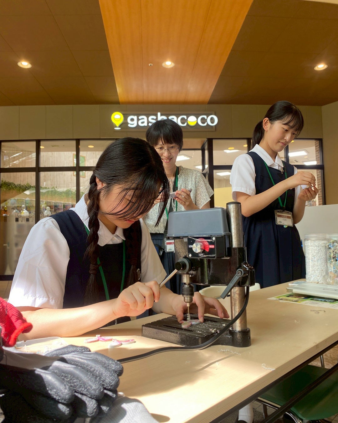 本ワークショップでは、雙葉高校の生徒たちが地域から集めたペットボトルキャップを、自らデザインした金型を用いて“Futabaのキーホルダー”へとアップサイクル。廃プラスチックが世界にひとつだけのアイテムに生まれ変わり、約100名の参加者(学校関係者や来場者の親子連れなど)が体験を楽しみました。