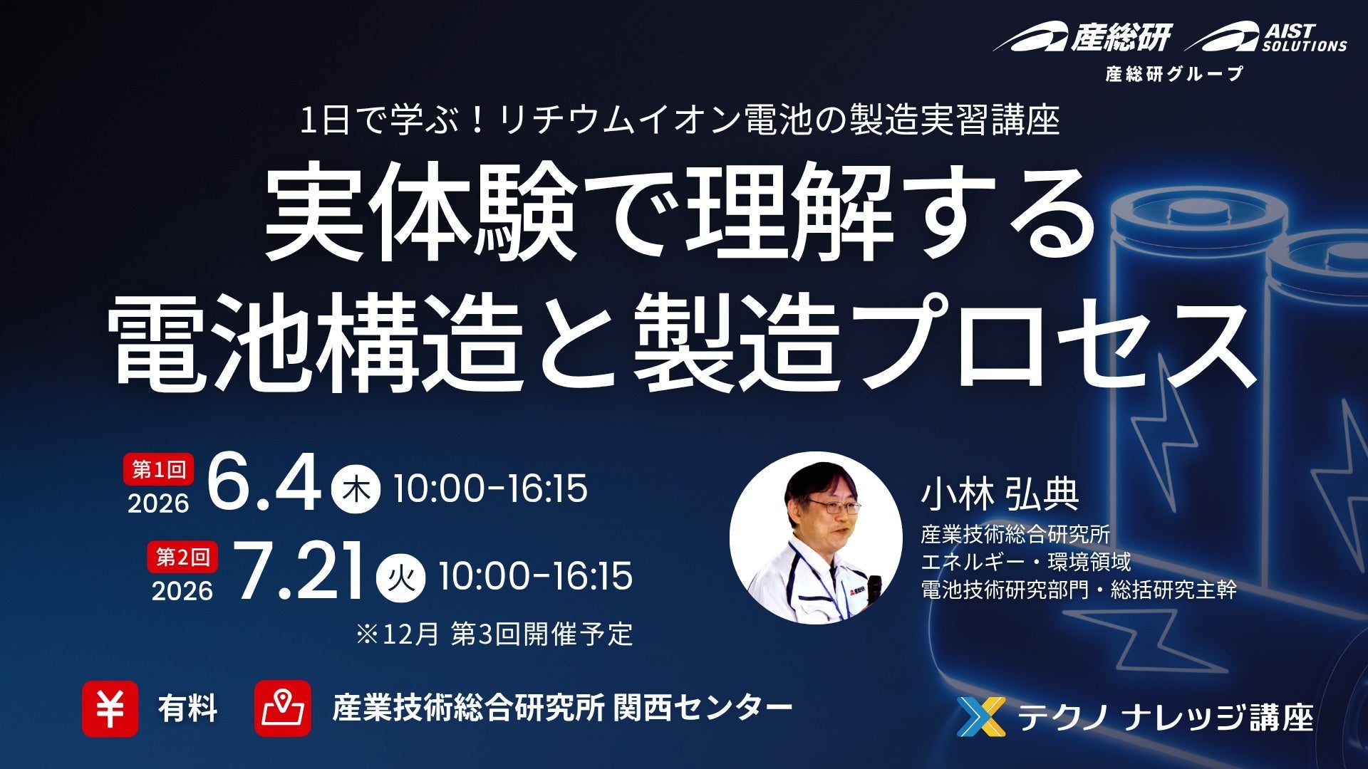 【産総研グループ:有料 テクノナレッジ講座】1日で学ぶ!リチウムイオン電池の製造実習講座 ~実体験で理解する電池構造と製造プロセス~(6/4,7/21 in 関西)