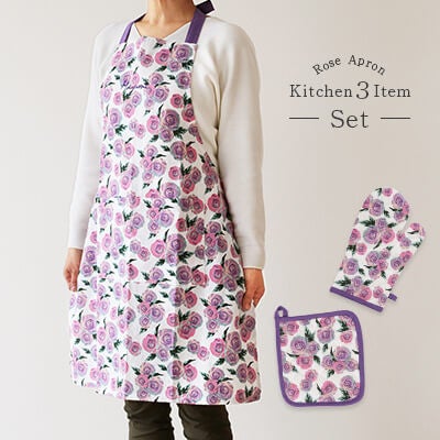 エプロン・ミトン・鍋敷きの3点セット。