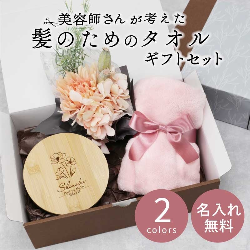 お名前やメッセージを彫刻した小物入れ、ブーケがセットになったギフト。