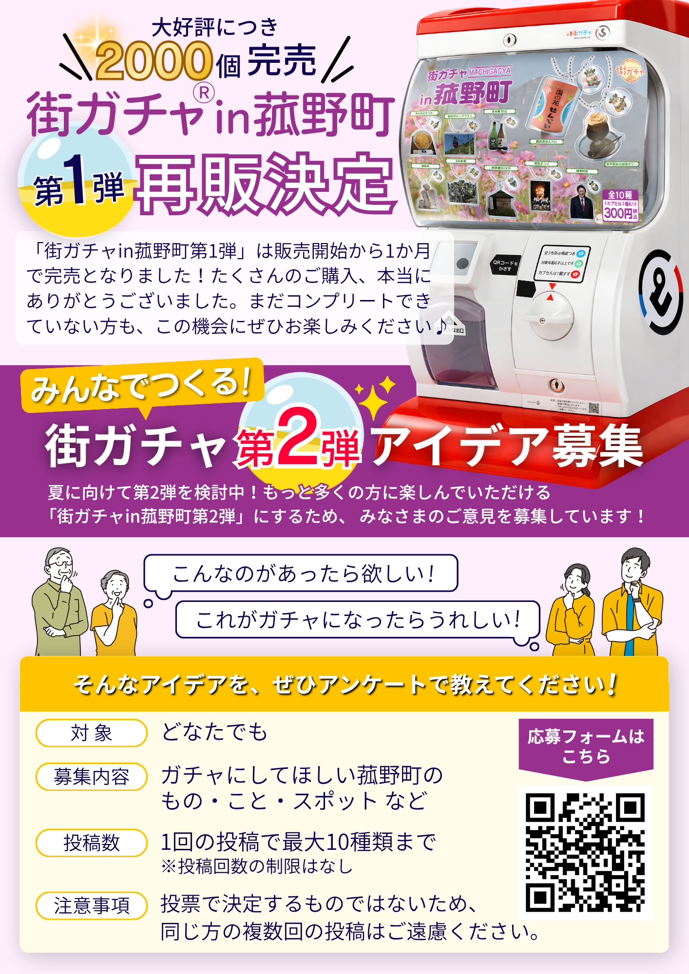大好評につき販売1か月を待たずに完売したご当地カプセルトイ「街ガチャin菰野町」が、待望の販売再開!さらに、第2弾企画のアイデア募集も同時に始まります!あなたのアイデアがガチャガチャに!!