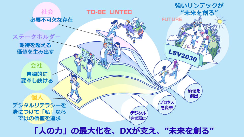 リンテックはこのたび、経済産業省が定めるDX(デジタルトランスフォーメーション)認定制度に基づき、「DX認定事業者」の認定を取得しました。2030年のあるべき姿を見据えた長期ビジョン「LINTEC SUSTAINABILITY VISION 2030(LSV 2030)」では、重点テーマとして「イノベーションによる企業体質の強靭化」を掲げており、その実現に向け、DXによる業務プロセスの変革を全社横断で推進しています。