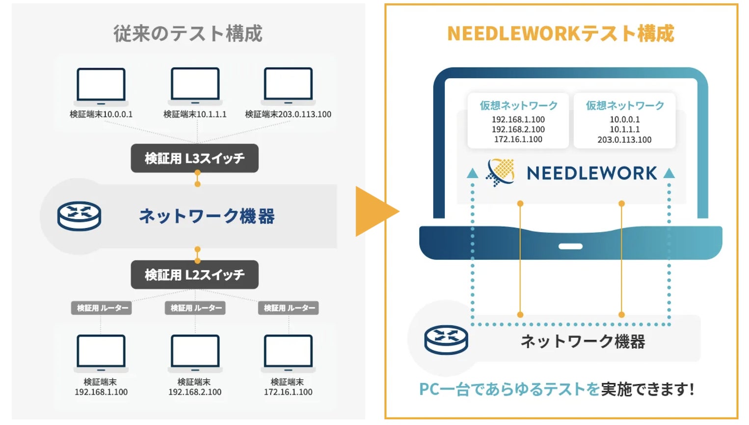 NEEDLEWORKを利用することにより、テストに必要な環境構築、手作業での人的ミスを排除することが可能です。また、自動化によりテストにかかる時間を大幅に削減することが可能です。