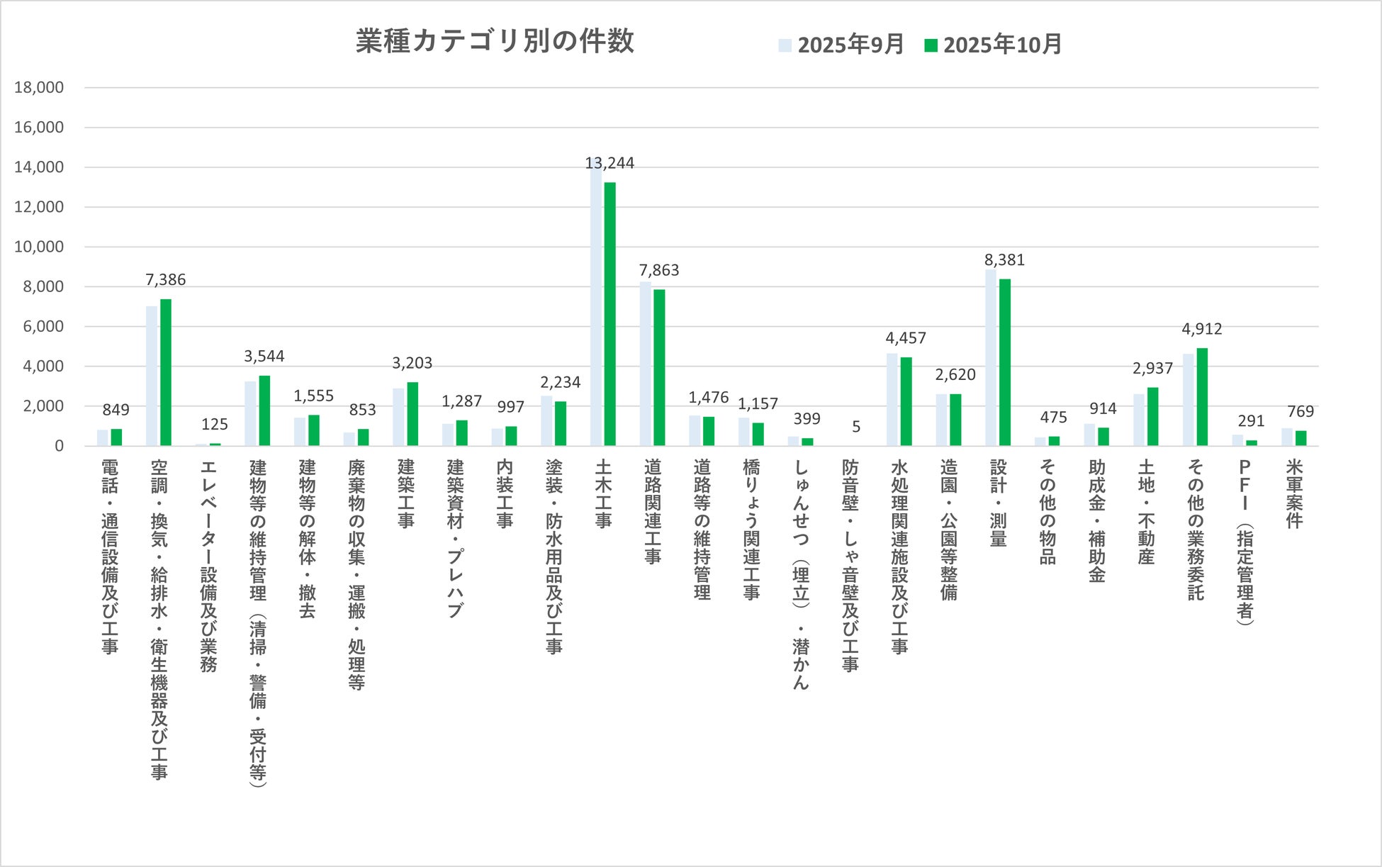 一方で、建設関連の一部では減少が見られ、「土木工事」は13,244件(前月比91.6%)、「道路関連工事」は7,863件(前月比95.3%)、「橋りょう関連工事」は1,157件(前月比81.0%)と減少しました。「設計・測量」も8,381件(前月比94.4%)となり、サービス・委託分野の一部でも減少が確認されています。