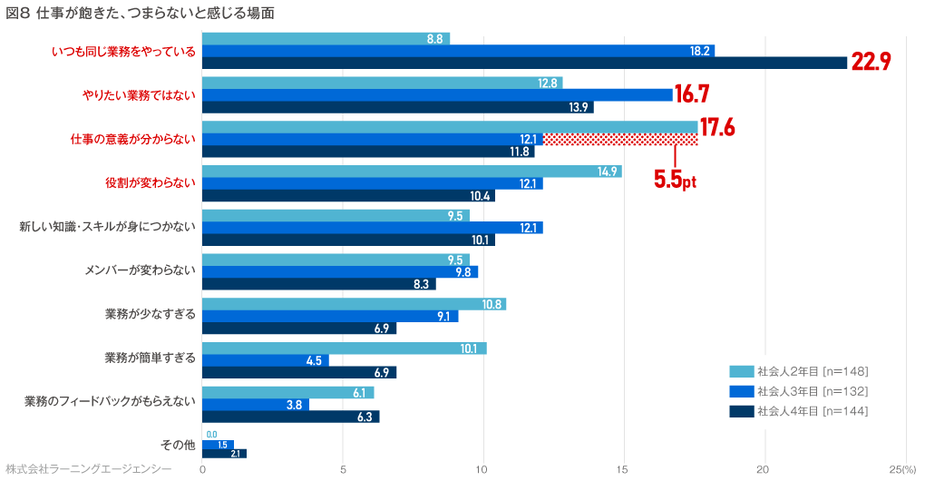 上位3つの項目は3,4年目が高く2年目は低い結果でしたが、「教えてくれる人がいない」という項目に関しては、2年目が最も高く18.5%となりました。また、割合はそこまで高くはないものの、「業務の意義が見いだせない」も2年目が最も高くなっています。