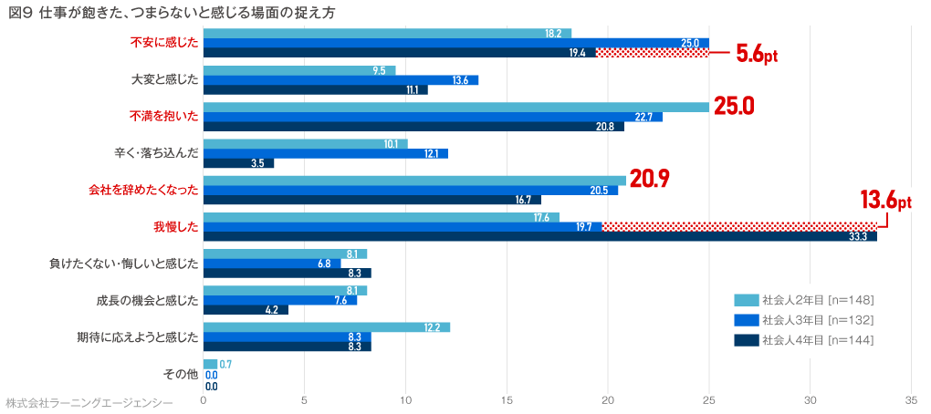 また、社会人3年目は、25.0%の人が「不安に感じた」と回答し、他年次と5ポイント以上の差が出ました。次に、22.7%の人が「不満を抱いた」と回答しました。