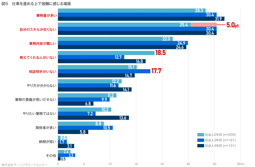 他の項目を見てみると、「相談相手がいない」「関係者が多い」においては3年目が他年次よりも高くなりました(17.7%、10.5%)。4年目に関しては、「やり方が分からない(14.1%)」「やりたい業務ではない(13.6%)」「納期が短い(3.1%)」が他年次よりも高い結果となっています。(図5)