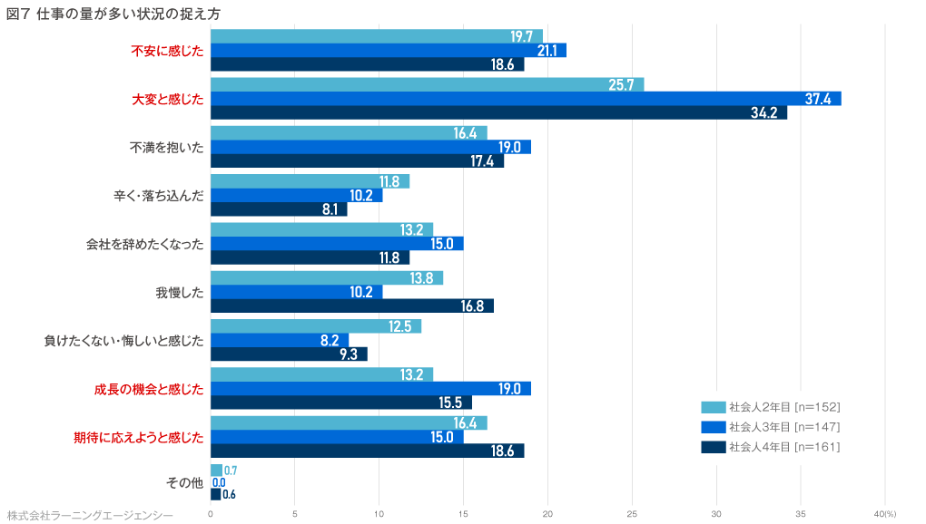 社会人4年目は「大変だと感じた(34.2%)」次に「不安に感じた(18.6%)」と続きましたが、「期待に応えようと感じた(18.6%)」も同等の割合で2位となりました。2年目3年目の3位にも「期待に応えようと感じた(2年目16.4%)」「成長の機会と感じた(3年目19.0%)」が入り、仕事を進める上での壁と同様、仕事の量に対しても、前向きに捉えて取り組む社員も一定数いることがわかります。(図7)