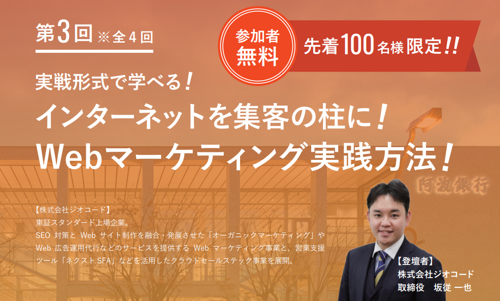 阿波銀行が10月27日に開催するマーケティングセミナーにジオコード取締役の坂従が講師登壇