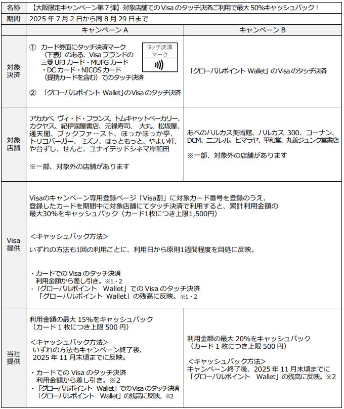 三菱UFJニコスは7月2日から8月29日まで、Visaブランドの三菱UFJカード・MUFGカード・DCカード・NICOSカードの個人会員(提携カードを含む)および「グローバルポイント Wallet」利用者を対象に、2024年4月からビザ・ワールドワイド(以下Visa)と共同で実施している大阪府限定の“Visaのタッチ決済”利用促進キャンペーンの“第7弾”を実施します。今回は、百貨店や飲食店、書店、ドラッグストア、映画館、ミュージアムなど多彩な対象店での利用で、累計利用金額の最大50%(上限2,000円)をキャッシュバックします。