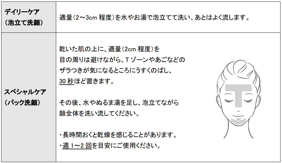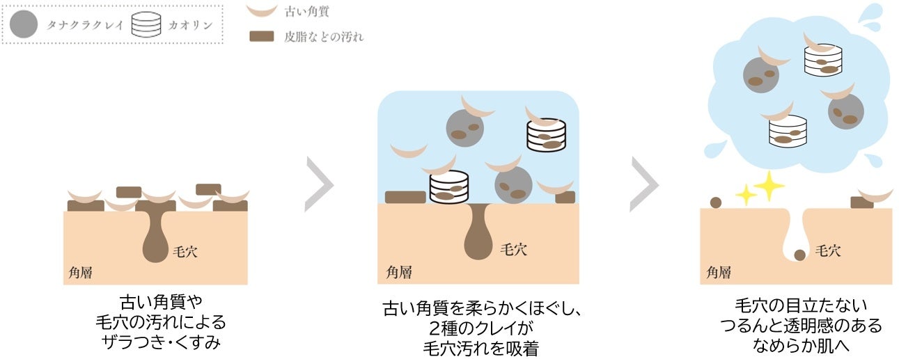 剤を肌に直塗りすることで古い角質を柔らかくほぐし、ゆるんだ皮脂などの汚れをすっきりオフ。毛穴汚れによるたまったザラつき、古い角質によるくすみ(*2)まで落とします。パック時に保湿成分が角層までしっかり浸透、つるんとなめらかな洗いあがりです。