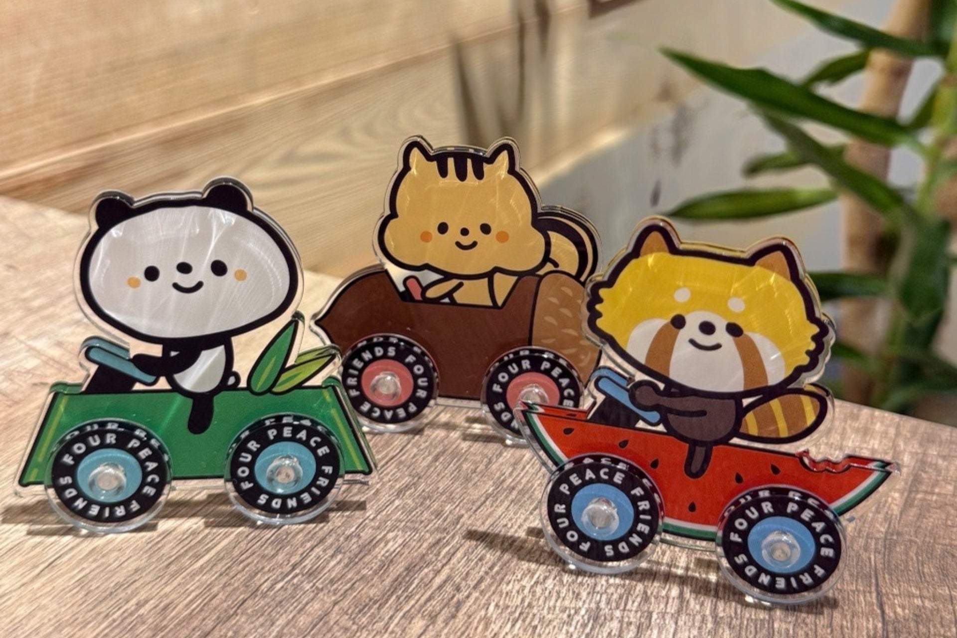 こちらは、大人気のふぉぴすオリジナルキャラクターたちがカートに乗っているアクリルスタンドです。なんとタイヤがついているため、コロコロと走らせて遊ぶことができます。