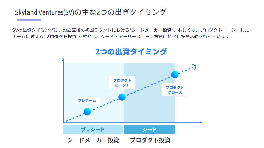 SVの出資タイミングは、設立直後の初回ラウンドにおける”シードメーカー投資”、もしくは、プロダクトローンチしたチームに対する”プロダクト投資”を軸とし、シード・アーリーステージ投資に特化し投資活動を行っています。