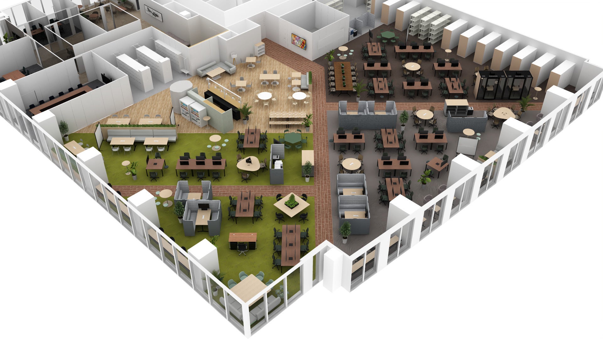 「街」をイメージした執務室は、中央を通る「道」で区画整理されています。