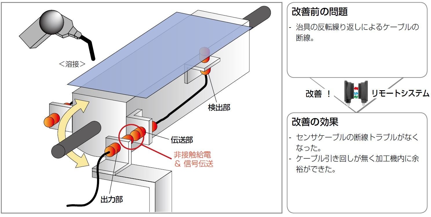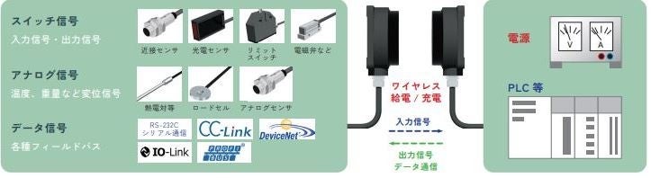 例えば、治具上、型上、インデックテーブル、搬送パレットなどで使用している近接センサや光電センサなど、各種センサへワイヤレスで電源を供給し、各種センサを動作させ、センサの検知信号をワイヤレスで伝送するシステムです。現在、国内の自動車メーカー様を中心に多くの実績があります。