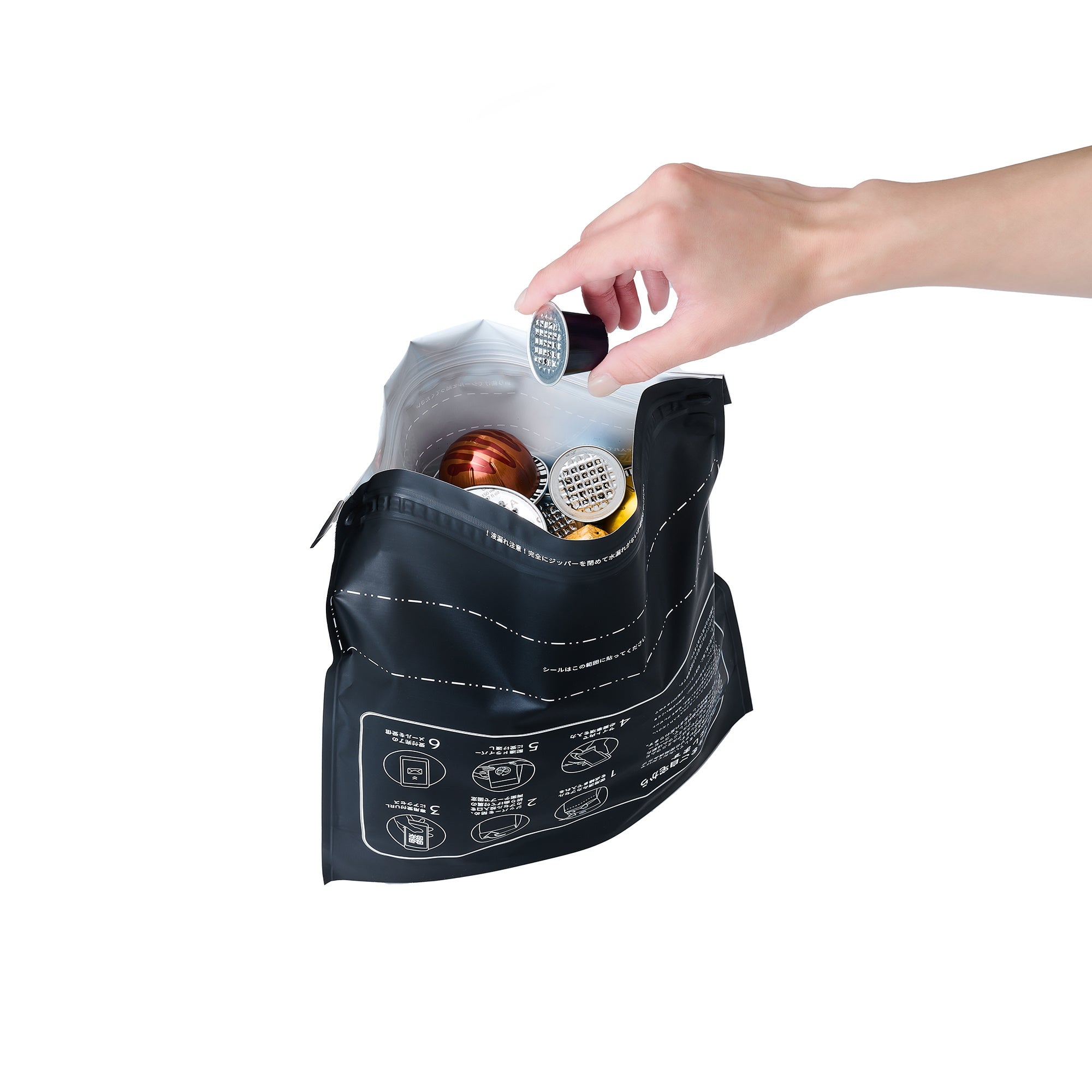 1. 全国の直営店舗「ネスプレッソブティック」、またはネスプレッソ公式ウェブサイトにて専用の「ご自宅回収用リカバリーバッグ」を購入し、ご自宅にて使用済みカプセルを所定の量まで集めます。