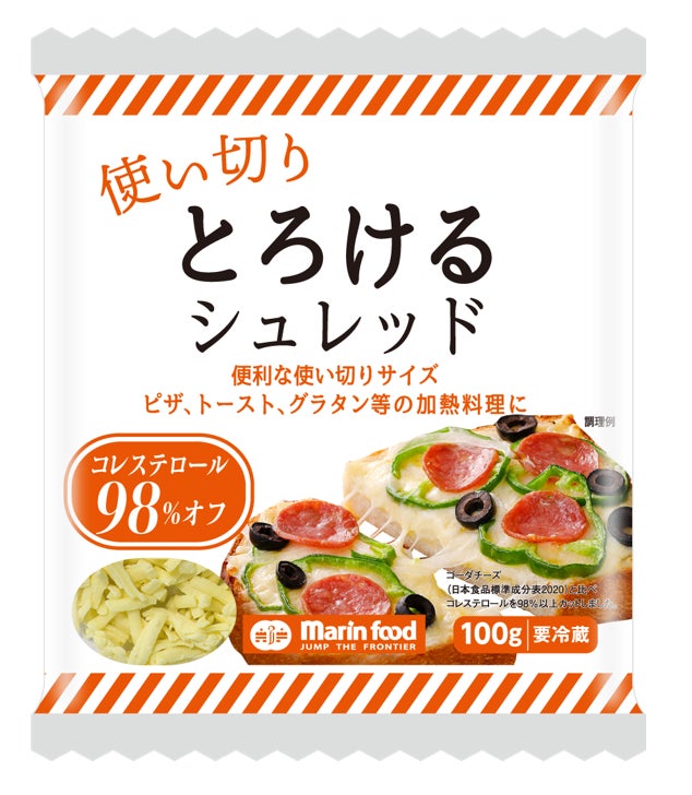 本商品は、チーズの主成分である乳脂肪の代わりに植物性油脂を使用したチーズ代替品で、ゴーダチーズと比較してコレステロールを98%※1以上カットすることに成功しています。チーズ代替品でありながら、通常のナチュラルチーズと同様にこんがりとした焦げ目がつきやすいため、ピザやグラタンなどの加熱料理などにも活躍します。また、原材料の植物性油脂は価格変動の影響を受けにくいため、ナチュラルチーズに比べてお求めやすい価格で販売いたします。