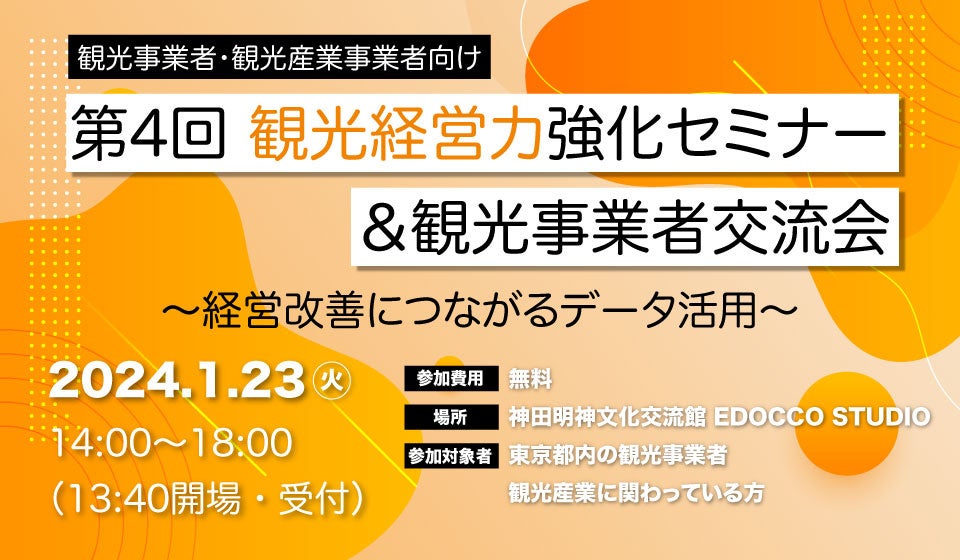 本イベントは、観光事業者を対象として、経営力向上を図り、観光産業の活性化につなげることを目的に、東京都及び東京観光財団が開催しております。第4回目となる今回は神田明神文化交流館、EDOCCO STUDIOで開催されます。ぜひこの機会にお申し込みください。