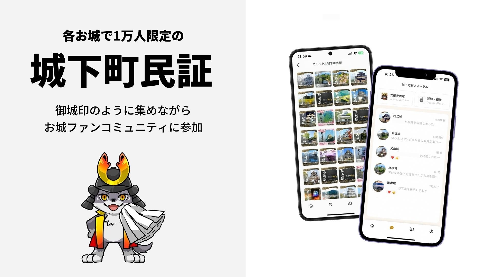 また、アプリとデジタル城下町民証を連携することで、登城またはプロジェクトへの支援時に城下町民証をグレードアップ(進化)することが可能です。城下町民証は複数保有することができるため、御城印を集めるようにコレクションできることも、お城ファンにとって大きな魅力となります。
