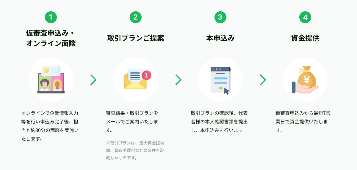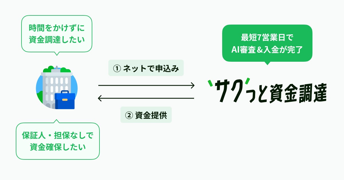 将来の売上を買い取ることで、すぐに使える資金を提供する中小企業向けの資金調達サービスです。申し込みから資金提供までオンラインで完結し、AI審査とオンライン面談を経て、最短7営業日で資金調達が完了します。そのため、一般的な銀行で融資を受けるよりも短い時間で簡単に資金を調達できるのが特長です。決算書・担保・保証人など全て不要なため、スピード面・心理面共に“サクっと”お手軽にご利用いただけます。