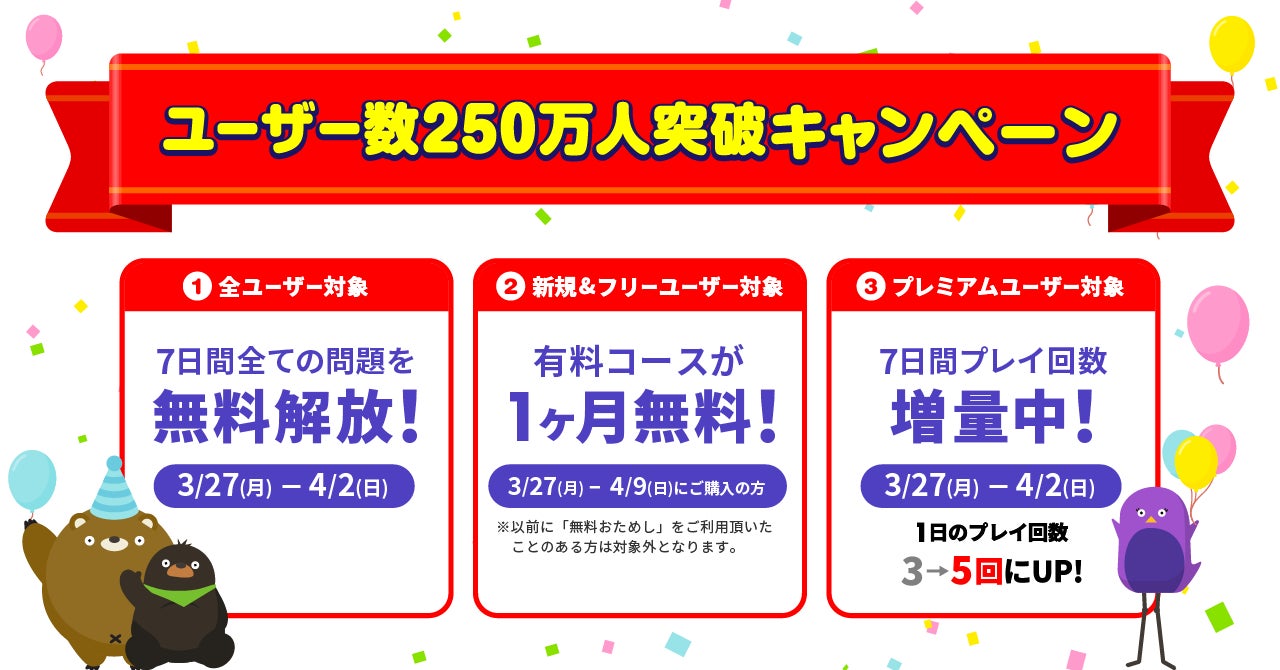 | キャンペーン① 全ての問題(プレミアムコースの内容)を無料でお楽しみいただけます。 対象:全てのユーザー 期間:3/27(月)〜4/2(日) キャンペーン② 期間中のお申し込みで、有料コースを1ヶ月間無料でご利用いただけます。 対象:新規もしくは、フリーユーザー 期間:3/27(月)〜4/9(日) *1ヶ月間無料でご利用いただくには、上記期間中の購入が必要です。 *以前に「無料おためし」をご利用いただいたことのある方は対象外です。 キャンペーン③ 通常1日3回のプレイ回数を5回に増量しお楽しみいただけます。 対象:プレミアムユーザー 期間:3/27(月)〜4/2(日) |
