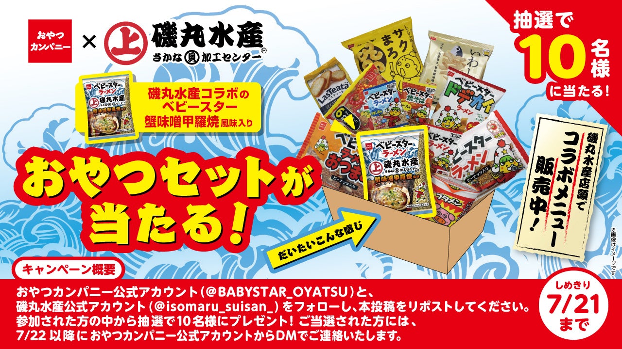 磯丸水産と「ベビースター」がタッグを組み、おやつカンパニー公式Xにてコラボキャンペーンを実施します。磯丸水産公式Xアカウントとおやつカンパニー公式Xアカウントをフォローし、おやつカンパニー公式Xの該当キャンペーン投稿をリポストした方の中から抽選で10名様に、磯丸水産とのコラボベビースターも入ったお菓子詰め合わせをプレゼント!