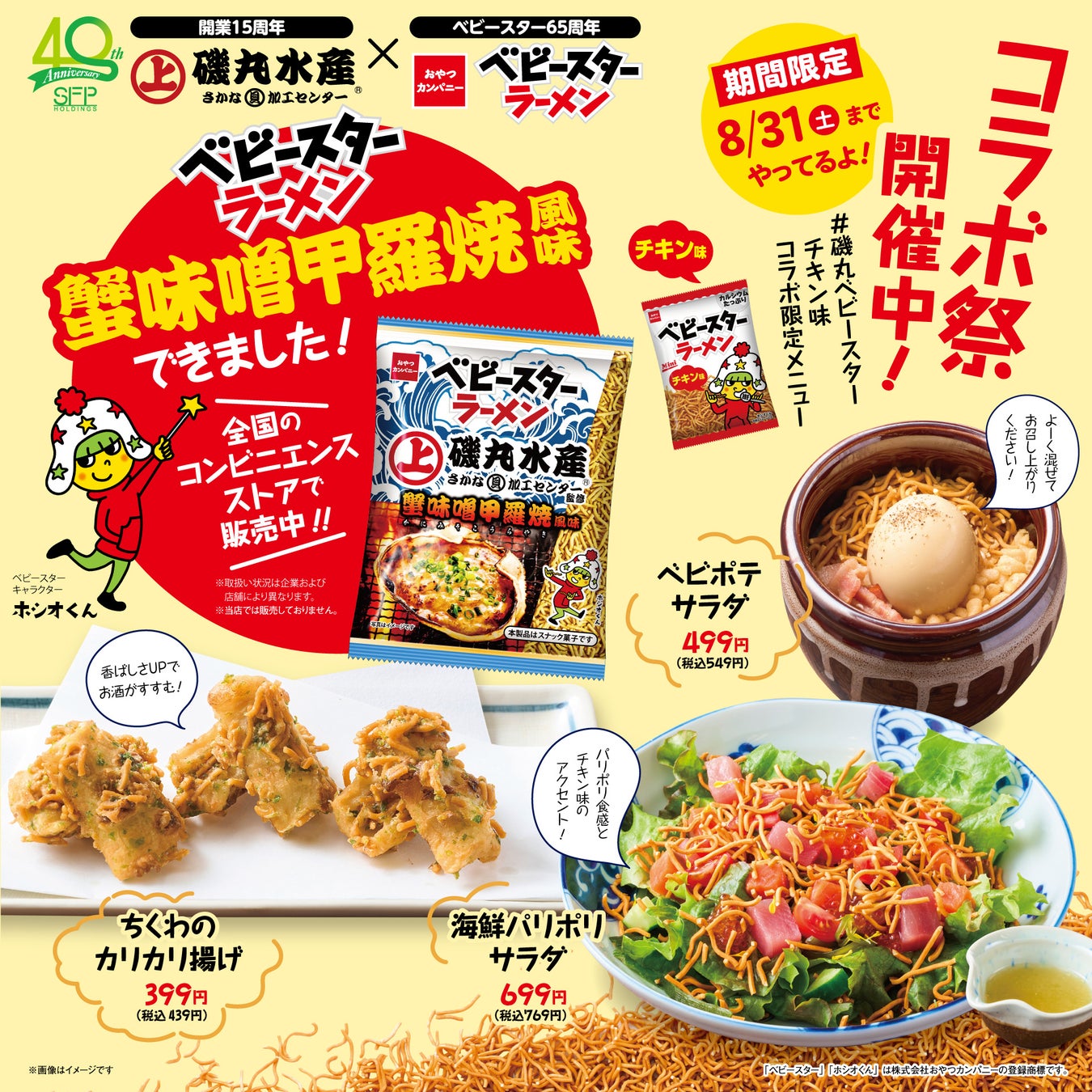 海鮮居酒屋「磯丸水産」をはじめ多数の居酒屋を運営する SFP ホールディングス株式会社(本社:東京都世田谷区 代表取締役社長: 佐藤誠)は、2024年7月15日(月)より磯丸名物「蟹味噌甲羅焼」を表現した「ベビースターラーメン(磯丸水産監修 蟹味噌甲羅焼風味)」と「ベビースター」のアレンジメニューを期間限定で販売いたします。