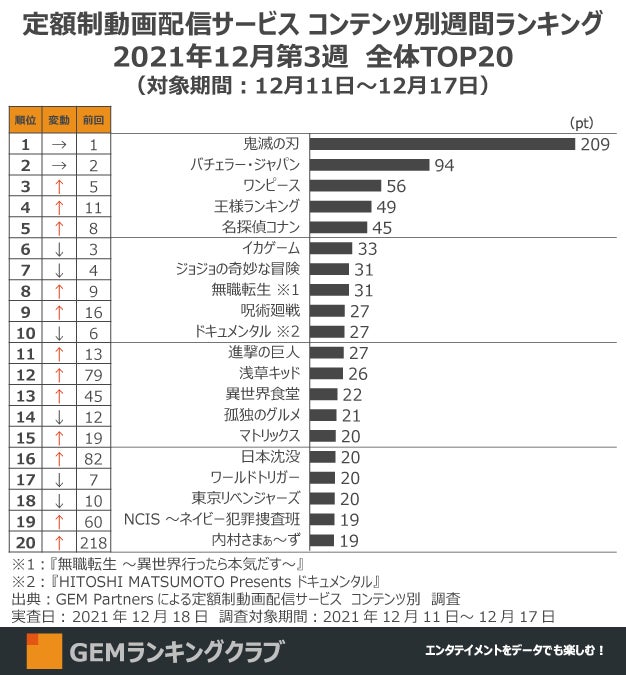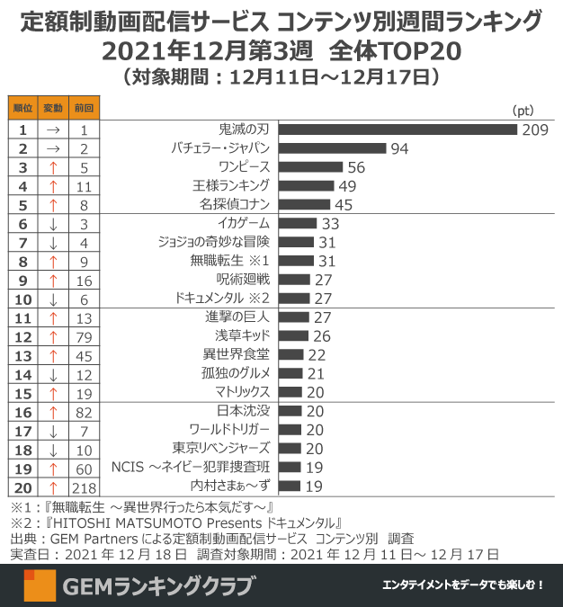 エンタテイメント業界に向けたデータ×デジタルマーケティングサービスを提供するGEM Partners株式会社(ジェムパートナーズ、所在地:東京都港区、代表取締役:梅津文)は12月23日(木)、エンタメコンテンツランキングやデータ情報を発信する「GEMランキングクラブ」プロジェクトにて作成した2021年12月第3週の「定額制動画配信サービス コンテンツ別週間ランキングTOP20(実査日:12月18日、調査対象期間:12月11日~12月17日)」を発表いたします。