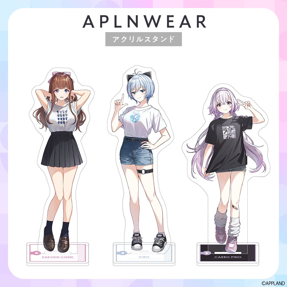 『アプランウェア』に関して、当社が運営する公式グッズ販売サイト(APPLAND OFFICIAL SHOP)にて2025年5月15日(木)より販売いたします!電脳少女シロ、花京院ちえり、カルロ・ピノの3名をイメージした、カジュアル性や着やすさ、着心地の良さを目指したTシャツとそれを着た3名のグッズが登場!夏に備えて、3人とのお揃いTシャツをぜひお楽しみください!