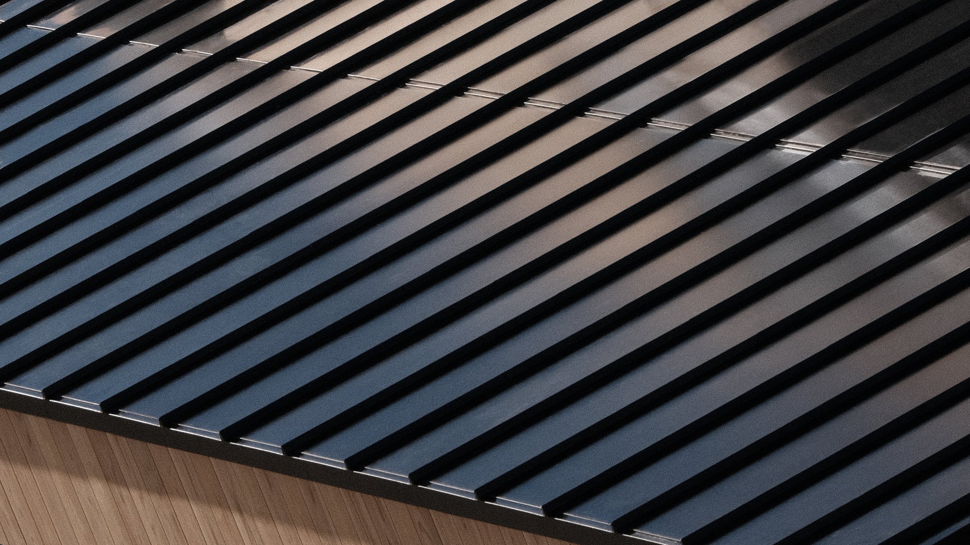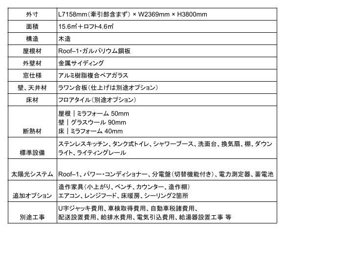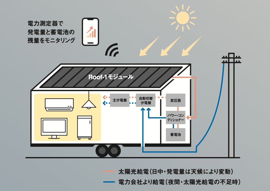 Roof–1は金属屋根に特殊加工した太陽光セルを組み込むことで、普通の屋根にしか見えないデザインを実現した屋根一体型太陽光パネルです。一般的な住居用太陽光パネルの屋根・架台・太陽光パネルの設置に比べ、屋根だけの設置となるため1回の施工で完了します。また、重量や高さに制限があるトレーラーハウスには通常の太陽光パネルよりも軽量で厚みが少ないRoof–1を採用することで天井高の確保や、重量のある設備機器などが設置可能になるという大きなメリットがあります。Roof–1は耐候性の高いフッ素塗膜に守られているため、25年間メンテナンス不要(*1)。10年~15年ごとの太陽光の脱着と再塗装が必要な一般的な屋根に架台式太陽光パネルを設置した場合と比べて、トータルコストを抑えることができます。太陽光モジュールは25年間無償出力保証(*2)、さらに金属屋根は25年間無償保証(*3)です。